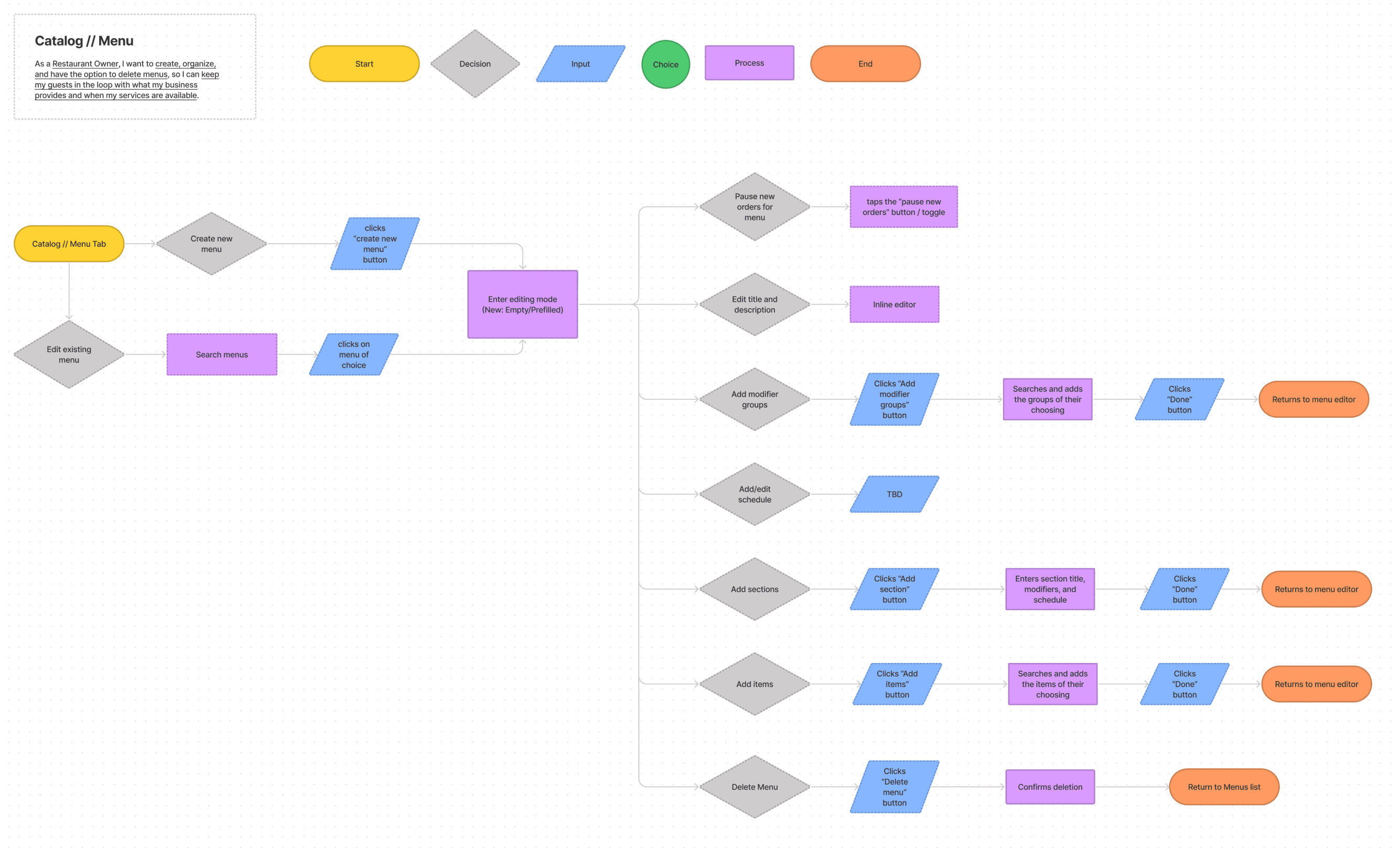 The photo above is a User Flow we made for the restaurant owner based on their User Story in the top left. This covers how they’d complete the tasks needed to publish their food catalog.