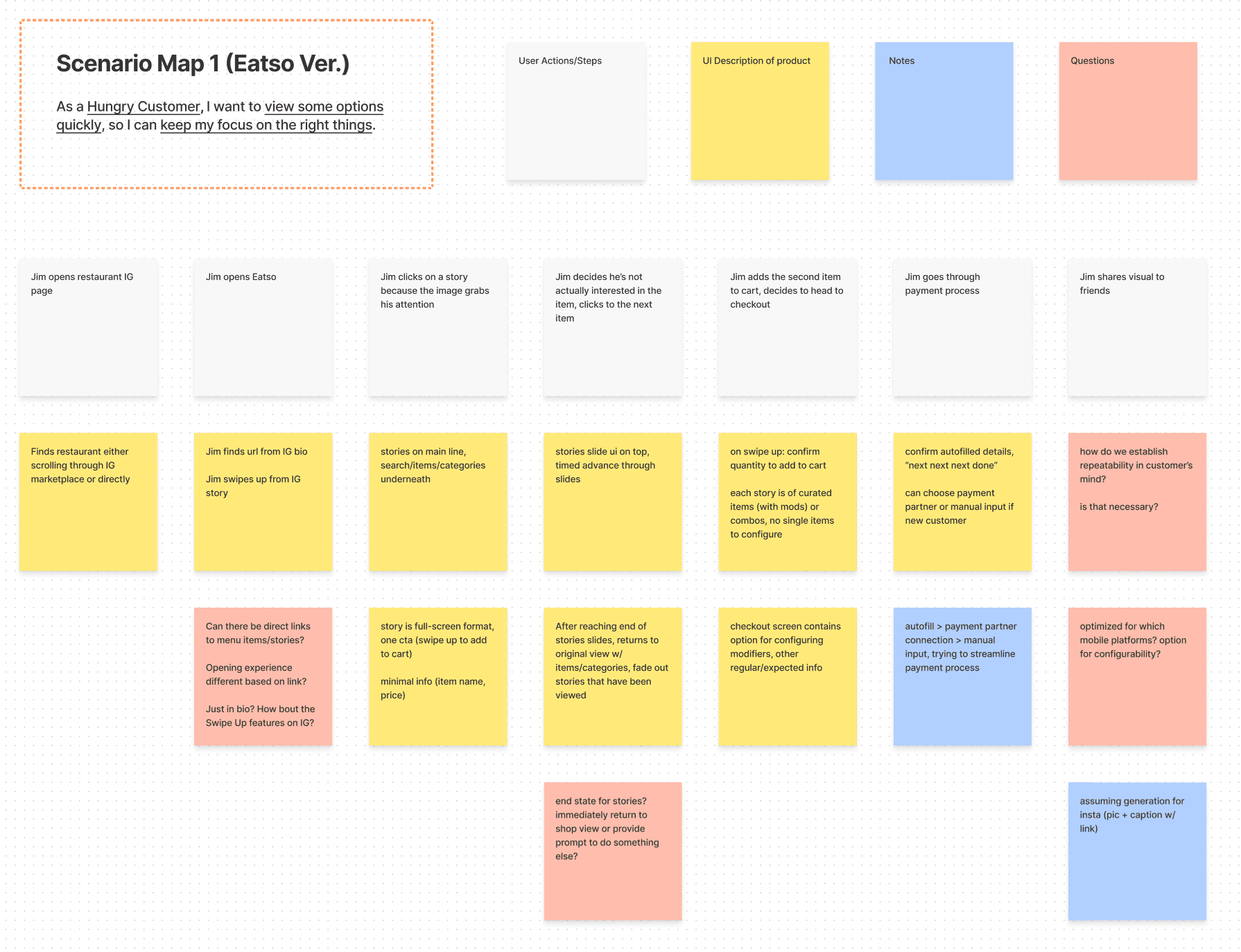 Here’s one of the many Scenario Map we made for the customer. Knowing this customer values their time, this map focuses on a scenario where Eatso is flexible and convenient using social media account stories.